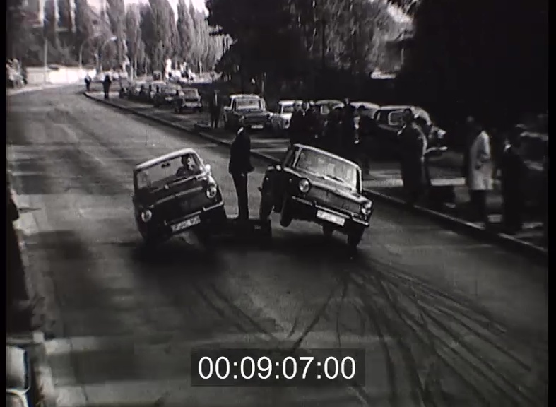 Kaszkadőr-bemutató. Az operatőr is beszáll a kocsiba. Két keréken szlalomoznak, az egyik kaszkadőr kiszállva integet.