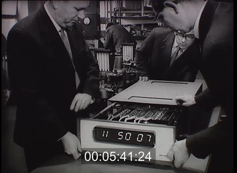 Műszeripari Kutató Intézet. Kvarcvezérlésű óra bemutatása. Órabelső. Kvarcrudak, vezéróra. Egy férfi a kijelzőt mutatja.