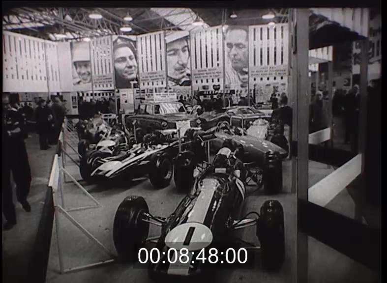 London. Versenyautók kiállítása. Lotus, Lola, Ferrari, Cortina. Speciális autók gyorsasági versenyekhez. Gyorsasági verseny.