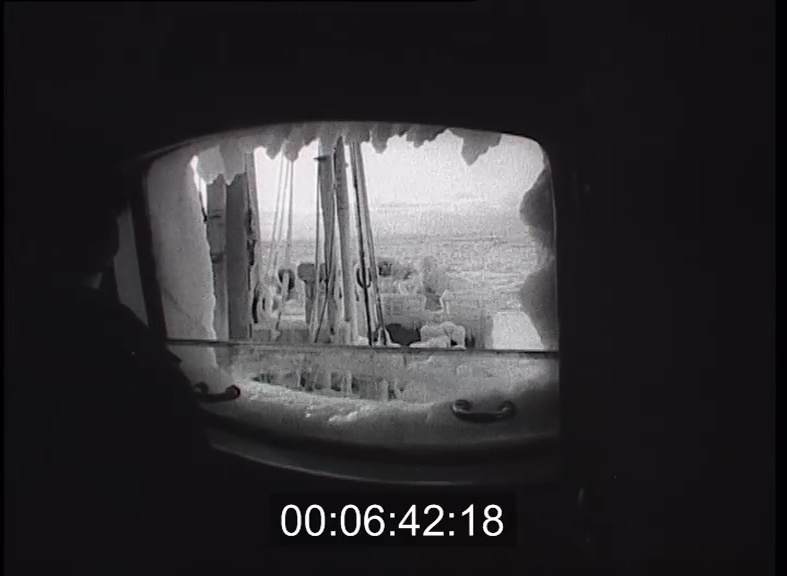 A Pengina nevű szovjet tengerjáró az Északi-tengeren. A jégpáncélba borult a fedélzet. A tengerészek eltávolítják a jégpáncélt.
