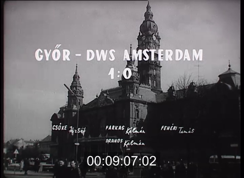 Labdarúgó sportunk történetében először Európa Kupa mérkőzés vidéken. Fúvós zenekar a győri utcán. Trombitaszó és fapapucs a Vörös Csillag Szálló előtt. A holland bajnok a DWS a Rába parti város vendége, s az amszterdami 1:1 után sok száz szurkoló kísérte kedvenceit Magyarországra. Ez a turbános holland ravaszul a magyar szurkolók között helyezkedett el. De már kezdődik is a játék. A csíkos mezes Győri ETO támad. Ott van a labda a hollandok tizenhatosa tájékán. Keglovich tör előre, ballal továbbítja, Győrfi előtt a labda, Schrijvers azonban belelépett, és Jongbloed kapus hárítani tud. Újabb támadás, Orosz kapja meg a labdát, gyönyörűen ível előre a tizenhatosra, Győrfi háttal a kapunak fejel, és a kapufa segítségével tud hárítani Jongbloed kapus. Remek fejes volt. Holland ellentámadás. A balszárnyon fut föl az akció. Hollender, a balszélső kapja meg a labdát, átvágja keresztbe a másik oldalra, Rose, a jobbszélső egy jó csel után 18 méterről ballal lő, Tóth kapus azonban szépen lehúzza a veszélyes labdát. Remek a játék. Megint ott van a magyar támadás. Schrijvers röviden ad haza, Győrfi elcsípi, keresztbe vágja, de nincs ott senki, aki gólba lőné. És még mondja ezután valaki, hogy a Győrnek volt szerencséje. Íme most is Povázsai lövése levágódik az alapvonalon túlra. Támadás támadást követ. Ott pattog a labda a tizenhatosnál, odakerül ismét Povázsai elé, Povázsai jobb lábbal lő, gól. Óriási gól, 1:0 arányban győzött a Győri ETO ezzel a góllal a DWS Amsterdam ellen. Jongbloed kapus fájdalmában, keserűségében a földet veri, de ez sem változtat azon a tényen, a Győri ETO Európa legjobb négy klubcsapata között van.