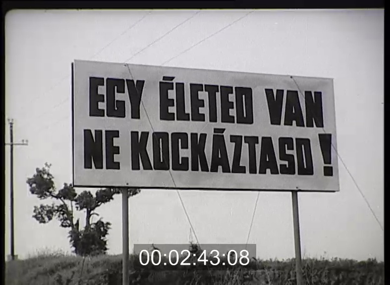 Óvatosabb közlekedésre, a KRESZ előírásainak fokozottabb megtartására inti a gépkocsivezetőket a megnövekedett közúti forgalom. A gyorshajtás, a szabálytalan vezetés mind-mind balesetek forrása. A veszélyes kanyarokban, a sebességkorlátozó tábláknál ezért ellenőrzik a sebességet a közlekedésrendészet emberei radar elven működő műszerekkel. A szabálysértést ilyen gépkocsiba szerelt automata fényképezőgépekkel rögzítik a cirkáló járőrök. Ez a kocsi például a kanyarban átlépte a záróvonalat és ezzel súlyosan vétett a KRESZ előírása ellen. Most szerencséje volt, de könnyen összeütközhetett volna ezzel a szembejövő autóval. A fotók így rögzítették a szabálytalanság fázisait. Itt nincs mese, fizetni kell! A közúti ellenőrzés másik módja a helikopteres őrjárat. A magasból több kilométeres körzetet lehet megfigyelni. A helikopter személyzete állandó rádióösszeköttetést tart az országúti URH-s kocsikkal. (Szinkron) "Öttonnás teherautó zsákokkal megrakodva, az árokban". A helyszínre irányított járőr első megállapítása: a gépkocsivezető ittas volt. A növekvő forgalom megkívánja az óvatos vezetést! Az úttest nem versenypálya. Egy életed van, ne kockáztasd!