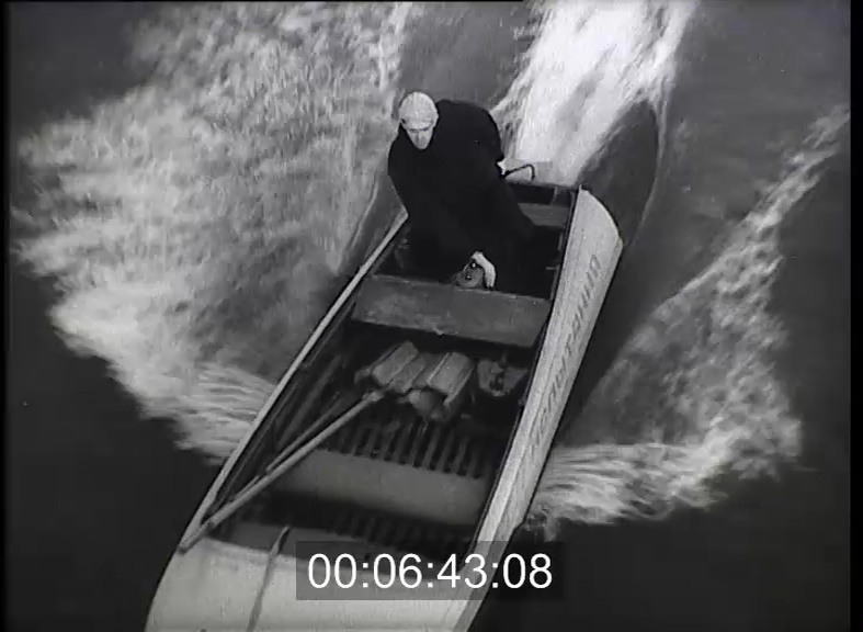Vízsugaras szovjet tervezésű motorcsónak kipróbálása akadályokkal tarkított vízen.
