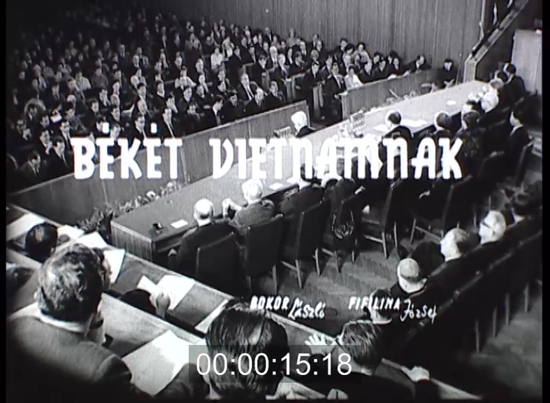 Nagygyűlés az Építők Székházában a vietnami szolidaritási hét keretében. Részt vesznek a Béka Világtanács Budapesten ülésező elnökségének képviselői és a Vietnami Demokratikus Köztársaság képviselői is. . Felszólalók /bemondószöveg/: Isabelle Blume asszony ügyvezető elnök a világ békeharcosainak nevében. Sík Endre az Országos Béketanács elnöke. Abdoulaye Diallo guineai küldött Afrika képviseletében. Alfredo Varela Amerika képviseletében /argentin író/. Gollsa, Villiam - Ausztráliából.