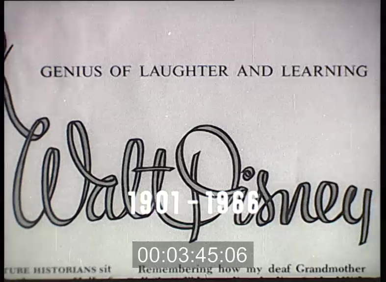 Megemlékezés, halála alkalmából. (1966. dec. 15.). Fotók: Walt Disneyről egyedül, az I. világháborús fronton, fiatal operatőrként a kamera mögött, Shirley Temple és W. Disney egy mikrofon előtt, családja körében. Rajzai, rajzfigurái /állóképek/. Kiselefántot húznak egy kiskocsin totemoszlopok előtt a stúdióban, egy leopárd fotója a vadonban. Walt Disney Oscar-díjai között, egy földgömb grafika előtt.