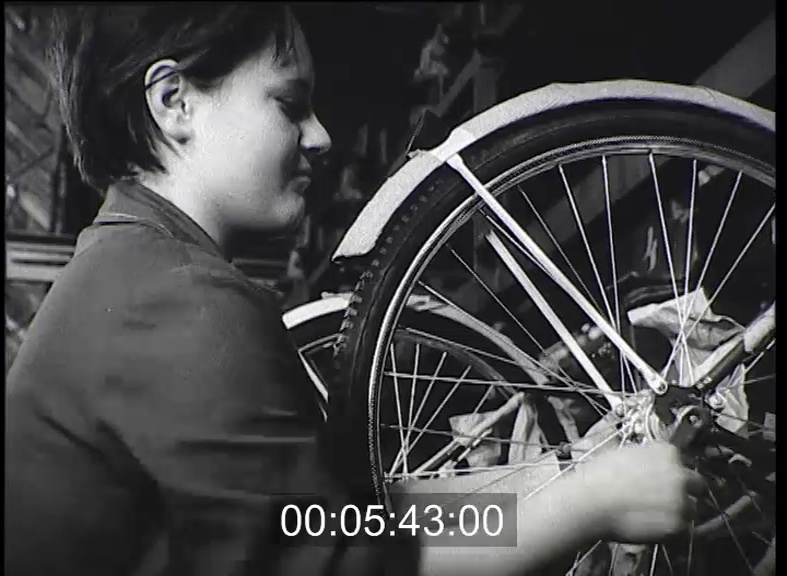 Kerékpárüzem. Az összeszerelást lányok, asszonyok végzik.