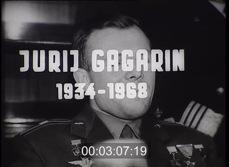 Rakéta kilövése, trükkfilm, fényképek Gagarinról, Brezsnyev kitünteti, részvétlátogatás a Szakszervezetek Központi Székházában: Brezsnyev, Koszigin, Podgornij, temetési menet, urna elhelyezése a Kreml-Mauzoleum falánál.