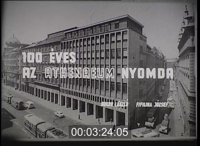 Ez a ház itt a Rákóczi út és Osváth utca sarkán, s a mögötte húzódó tömb az ország legnagyobb nyomdaüzeme, a 100 éves Athenaeum. Egykori Barátok téri őséről készült ez a festmény. Egy nyomdász dinasztia megalapítója, Wágner Antal szedőgép-szerelő nagyapja még itt kezdte a szakmát a múlt század végén, az ólomgőzős, kézműves nyomdában. Az Athenaeum 100 éve egyben igazi kultúrtörténet is. Kapcsolatban álltak Arany Jánossal, Kossuth Lajossal, itt került sajtóprés alá a "Hon" Kemény Zsigmond, s a "Pesti Napló" Jókai Mór szerkesztésében. Innen került utcára első szatirikus lapunk, a Borsszem Jankó. Sok emlékezetes, pazar kivitelű album, irodalmi antológia, valóságos könyvészeti remekmű született itt. A Körút felőli szerkesztőségi szárnyban évtizedekig dolgozott Móricz és Heltai, Szomori, Molnár, Karinthy, Lengyel Menyhért és Ambrus Zoltán. A régi időkre emlékezve kegyelettel őrzik az üzemben ezt a Gutenberg kéziprést. 1945. januárjában ezen nyomták ki a Szabadság című lap első példányait. Ma gombnyomásra indul a három emelet magas, olasz gyártmányú Cerutti gép. Hengersorán naponta félmillió példányban készül a Népszava, a Magyar Nemzet és a Magyar Hírlap. A többszínnyomó rotációs gép ezen kívül heti 2 millió hetilapot és folyóiratot nyom. Sok nemzetközi sikert értek el könyveikkel is, amelyekből havonta egymillió lát napvilágot a 100 éves Athenaeumban.