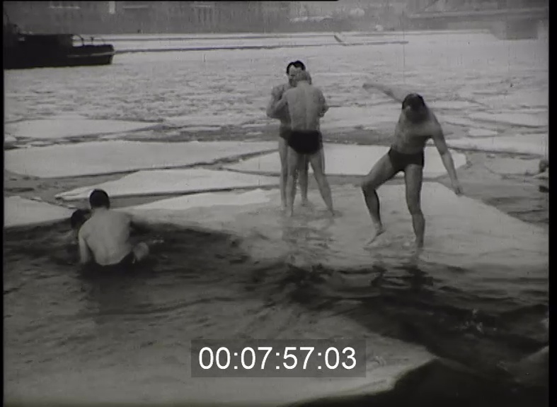 Ezen a márciusi napon mínusz 12 fokot mutatott a hőmérő Moszkvában. De itt úgy látszik nem csak egy Schirilla van: egész kis csapat érkezik a jeges Moszkva folyóhoz. A nézők még kabátban is dideregnek, ám az edzett emberek vidáman lubickolnak a jégtáblák között.
