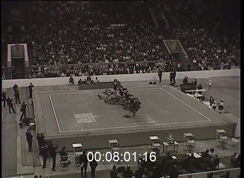 Nemzetközi művészi torna verseny a moszkvai Sportpalotában hét ország legjobbjainak észvételével. A magyar bajnok, Patocska Mária szalagtánca. A bolgár Krassimira Filipova, a verseny második helyezettje. A szabadon választott gyakorlatokban a szovjet Ljuba [sic!] Sereda lett a győztes.