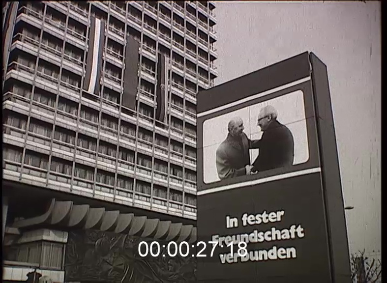 A berlini új tévétorony jelkép. Hirdeti a szocialista német állam társadalmi, gazdasági sikereit. A lapok vastagbetűs címoldalai, a fellobogózott utcák, a transzparensek magyar vendégeket köszöntenek. Kádár János vezetésével párt és kormányküldöttség járt az NDK fővárosában. A tavaly júniusban huszonkilenc európai kommunista és munkáspárt értekezletének otthont adó Berlint a tudósítások "a nemzetközi együttműködés fővárosának" nevezték. Ennek jegyében ült most tárgyalóasztalhoz az NDK és hazánk magas szintű küldöttsége. Megállapíthatták, hogy kapcsolataink az elmúlt években minden téren dinamikusan fejlődtek és megvan az alapja a további együttműködésnek. E tényt jól példázta az Oberspree-i Kábelművek "Wilhelm Pieck" törzsüzemében tett látogatás. A gyárban a Magyar Gyár és Gépszerelő Vállalat negyven fős brigádja dolgozik a gyárberendezések rekonstrukcióján. Egyik műhelyét teljes egészében Diósgyőrben készült gépekkel szerelték fel. Ezért itt különös szeretettel fogadták a magyar küldöttséget. Az internacionalista együttműködés további lehetőségeit rögzíti szerződéspontokba az az okmány, amelyet a Magyar Népköztársaság nevében Lázár György miniszterelnök és Kádár János, német részről Erich Honecker, a Német Szocialista Egységpárt főtitkára, az államtanács elnöke írt alá. A két magasrangú vezető volt a szónoka annak a nagygyűlésnek is, amelyet a köztársasági palotában rendeztek meg. Mindkét szónok az Európa békéjével és biztonságával összefüggő, nagy felelősségről beszélt, hiszen emlékezetes még a háború, amelynek pusztító tüzét magyar és német földön egyaránt a Vörös Hadsereg oltotta ki. Amikor a magyar küldöttség a vendéglátókkal közösen elhelyezte koszorúit a Treptow-i parkban, a szovjet felszabadítókra emlékezett.