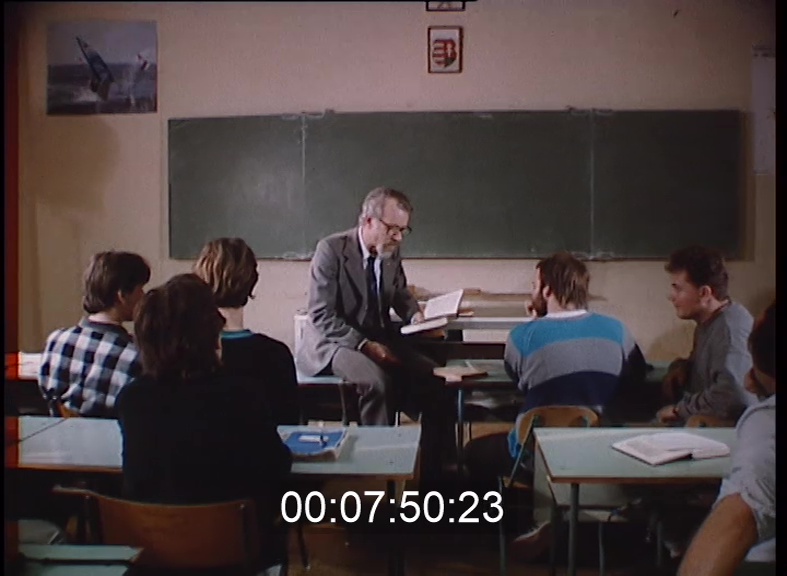 [Riporter, dr. Horányi István szinkron]: "- A készülő új tankönyv írója gyakorló pedagógus dr. Horányi István. Hogy látja ön, hányféle múlt van? - Szerintem csak egyfajta múlt van, egy múlt létezik, amíg tanultam az hét-nyolc átértelmezés volt, a mai napig most 12-nél tartok. Az első a felszabadulás után követezett be, amikor a legújabbkor történelmet Sesztakov A Szovjetunió rövid történetéből fordították magyarra és jelentették meg a gimnáziumi tanulók részére. 1950-től kezdődően a történelemtanítást és általában minden iskolára vonatkozó nagyobb reformot valamilyen határozat, párthatározat, kormányhatározat, törvény vezetett be. Ezek a határozatok megszabták a múlt értelmezését, így kerülhettek be például az 50-es években történelem tankönyvekbe olyan párhuzamok, mint Farkas Mihály, Zrínyi Miklós és Mátyás király a magyar nép történelmében hasonló volumenű hadvezérek voltak. A 72-es párthatározat után a központi szervekre a következő feladatok hárultak: gondoskodniuk kellett, irányítaniuk kellett, csökkenteniük kellett, növelniük kellett, bővíteniük kellett, következetesen ellenőrizniük kellett stb. Na most a múltnak egyfajta leszűkítése okozott zavart vagy okoz zavart jelenleg is a tömegkommunikációban megjelenő rendkívül nagy mennyiségű átértékeléssel szemben." [Diákok szinkron]: "- Az 50-es évekkel kapcsolatban a tankönyv szókincse csak a bizonyos torzulásokig terjed és pl. az AVH-ról semmi nincs benne. - Az MDP ellenzéki pártjai fokozatosan elsorvadtak, majd csendesen elhaltak. - A Marshall-terv többek között a szocialista orientációjú országok kiéheztetésének kísérlete volt. - Magyarország a felszabadulást követő évtizedekben világviszonylatban is a leggyorsabban növekvő országok sorába került." [dr. Horányi István, riporter szinkron]: "- Itt van pl. 56, vagy más vitatott kérdés tanítása. Nyugodt és tiszta lelkiismerettel a jelenlegi tankönyvekből ezeket a történelemtanárok nem tudják tanítani. - Unokáink milyen történelmet fognak tanulni? - Remélem már történelmet fognak tanulni."