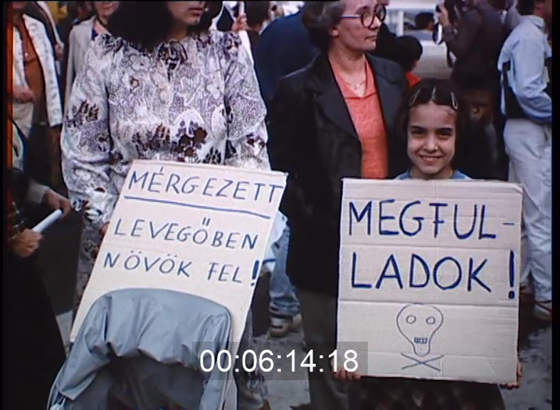 És azt is meg kell érteni, hogy a társadalmi érdekek most már nyíltan, olykor tüntetések képében lépnek színre. A fővárosi légszennyezés ellen tiltakozó anyák türelmetlenül várják az intézkedéseket. [Szinkron]: "...23 hónapos kisfiamnak az eredményével tisztába vagyok és kétségbeejtő. A norma egy 70 kg-os ipari munkás normája. 76 mikromól/liter. Az én 23 hónapos kisfiamnak ez az eredménye, 74. A 48 gyermek közül a legmagasabb érték 126 volt. - 25 éve itt lakom a környéken. De azt lehet mondani, hogy naponta mikor itt elmegyünk, szinte dudvát köpünk. Annyira piszkos itt a levegő. Kértük már nagyon rég a tanácsot, hogy tereljék el legalább a kocsikat. Maradjon a villamos és a buszok. Semmit nem intézkednek, vágni lehet a füstöt. - Kibírhatatlan a levegő különösen a nagy forgalomban. Nem is szoktunk ide jönni a Mechwart térre a játszótérre. A Gugger-hegyre szoktunk menni kirándulni, közelben mást, ami könnyen elérhető, olyat nem tudok mondani. - Csináltunk táblákat, kijöttünk, én szeretem a környezetet, de nem az ilyen piszkos levegőt. Én is amellett vagyok, hogy tereljék el a buszforgalmat." A zöldövezeti lakosság várható élettartalma megegyezik az NSZK adataival. A belvárosiak viszont várhatóan annyit élnek csak, mint a szírek. A korom és ólom első számú közellenségünk. Valami megoldást azonnal találni kell. Ilyen lehetne az a mechanikus szűrő, melyet Szabó Gábor mérnök ismertet [szinkron]: "Környezetvédelmi szempontból egy rendkívül jelentős ez a találmány és szerkezet, miután kis költséggel azonnal bevezethetően jó hatásfokkal tudja ezt a szűrést elvégezni. Jelentős még a kibocsátott koromnak a kiszűrése. Itt legalább 90 %-ról lehet beszélni." A feltaláló Bristyán Barna [szinkron]: "A szűrő gyakorlati használata alkalmával megállapítást nyert, hogy egy Wartburg gépkocsi esetében tízezer km futás teljesítménynél közel 3 kg korom, ólom, kátrányt köt le a szűrő." A kormány akár ingyen adhatná a szűrőket. Vagy kapjon adókedvezményt, aki felszereli. Vagy büntessék azt, aki nem használja. Mindegy. De ha idén nyáron nem történik intézkedés, a telet már így kezdhetjük a belvárosban.