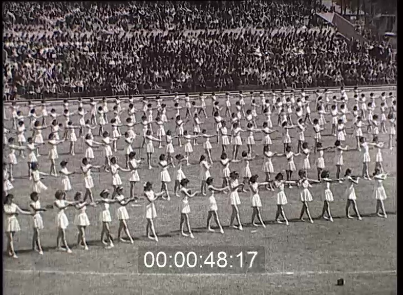 A Vörös Lobogó pályán több mint ezerhatszáz ipari tanuló részvételével tartották meg az Ipari Tanulók II. Országos Spartakiádját. Lányok karikagyakorlata. Gimnasztikai gyakorlatok. A látványos tornabemutató impozáns záróképpel fejeződött be.