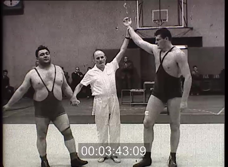És most adjuk át a küzdőteret az erős embereknek. Nyolc éve már, hogy Hódos Imre Helsinkiben olimpiai bajnokságot nyert, de tudása azóta sem kopott. A kötöttfogású bajnokság légsúlyú döntőjében ellenfele, Czellér szinte csak védekezésre kényszerült. Egymás után két nagyszerű akció, s az új bajnok neve a régi: Hódos Imre. A váltósúlyban a magyar birkózás két nagytudású versenyzője, Tarr és Deli küzd a bajnoki címért. Tarr hallatlan könnyedséggel, szép akciókkal győz Deli ellen és még mosolyog is hozzá. Talán egy emelődaruval könnyebben menne? De nem, a fiatal és tehetséges Kozmának nincs szüksége külső segítségre. Mint valami játékszert, úgy emelgeti a nem éppen pehelykönnyű debreceni Vászint. Végül egy hasonlóan nehézsúlyú néző nagy örömére győz Kozma.
