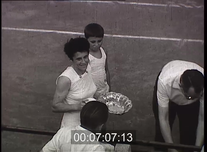 Körmöczy Zsuzsa, a legeredményesebb magyar teniszezőnő harminc éve lépett először versenypályára. Öt világrész ismeri játékát: tudását, szorgalmát és eredményességét a világ tíz legjobb teniszezője között tartják nyilván. És méltán, mert bajnoknőnk számos nemzetközi és hazai versenyen diadalmaskodott. Az idei magyar bajnokság női egyes döntőjében két játszmában győzött. Harmincéves sportpályafutása alatt ez volt Körmöczy Zsuzsa harmincadik bajnoksága. Kevés sportoló büszkélkedhet annyi díjjal, serleggel, éremmel, mint ő. A monte carloi verseny háromszori megnyerése után kapta ezt a fél kiló súlyú aranyserleget. Az 1958. évi párizsi salakpálya világbajnokság győztese is Körmöczy Zsuzsa volt. A wimbledoni bronzérem. A csehszlovák nemzetközi bajnokság győztesének díja. 1958-ban ő volt a legjobb magyar női sportoló. Bajnoknőnk a változatos edzés híve. Így megy ez egész éven át. Somogyi József mester tíz éve edzője Körmöczy Zsuzsának. Most éppen a hálójátékot gyakorolják. Aztán egy kis tréfának látszó, de igen fontos összpontosító gyakorlat. Sikerül-e megcélozni a dudát? Ez pedig a háló fölötti pontos ütést mutatja. De legkedvesebb edzőpartnere Zsuzsika, a bajnoknő 14 éves kislánya. A kis Zsuzsi máris nagy ellenfele a mamának. Ezúttal egy jól sikerült leütéssel győz Zsuzsika, de ez az eredmény egyelőre még a családban marad.