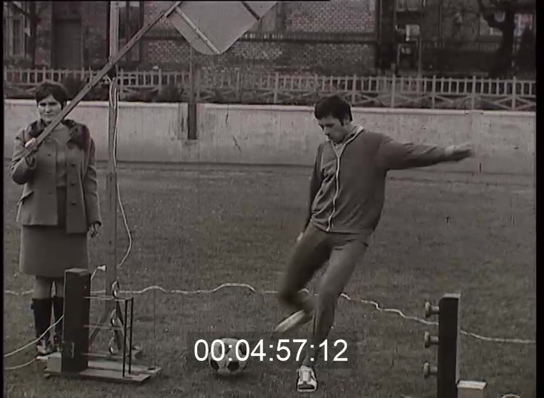 Az Alkotás utcában, a Testnevelési Főiskola Tudományos Kutató Intézetének laboratóriumában sok olyan gép és berendezés készül, amely a sportolók teljesítményét vizsgálja, hogy az egyes versenyzők gyengéit kimutatva segítsen az edzések kialakításánál. A sportolók megfigyelőképességét ez a készülék méri. A számokat utána rögtön le kell írni, méghozzá a látott alakzatban. Ezek a céltáblák a vívók cselekvési idejét mérik. A vívó fényjelzést kap, ekkor kell a kör közepébe szúrnia. A fényjelzés és a találat között eltelt időt önműködő gép méri és írásban rögzíti. A laboratóriumból most futballpályára viszik a berendezéseket, hogy a labdarúgók tulajdonságait elemezzék. Milyen gyorsan határozza el magát a futballista és hová küldi a labdát - itt ebből vizsgázik. Az elhatározás idejét önműködő készülék mutatja. Mehetne ez jobban is!