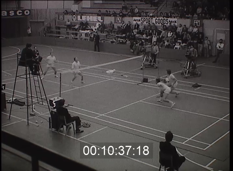 A tollaslabda rövid idő alatt igen népszerű lett világszerte. Egy félbevágott gumilabdát műanyag vitorlácskával házasítottak, s ezt a habkönnyű sportszert egy kisméretű teniszütővel röpítik a háló két oldalára. A szabályok az asztalitenisz és a teniszjáték elemeinek vegyítésével alakultak ki. Itt is kell adogatni, s a poénokat a védhetetlen labdák jelentik. Női és férfi számok mellett vegyes párost is játszanak. A Budapesti Sportcsarnokban rendezett nemzetközi versenyen nyugatnémet, NDK-beli játékosok ellen szerepeltek a magyar tollaslabdások. A férfi páros mérkőzést - amelyben a magyar versenyzők a harmadik helyet szerezték meg -, az NDK-beli Michalowsky fivérek nyerték a nyugatnémet Heyer-Rosenow párossal szemben. Most éppen a döntő összecsapást látjuk.
