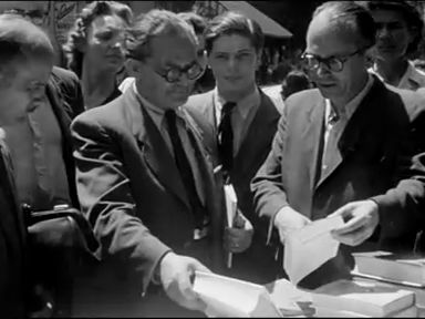 Könyvnapi sátrak a Nemzeti Színház előtt. Szikra, Népszava sátor. Rákosi, Szakasits, Kállai, Gerő a könyvsátornál. Veres Péter, Rákosi Mátyás, Révai József, Kállai Gyula, Kis Sándor könyvnézegetés közben.