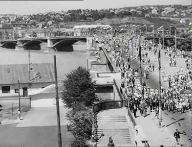 Romeltakarítók munkában: talicskákon hordják el a törmeléket. Vas Zoltán és Kővágó József a romeltakarítók között. Városházi tisztviselők, újságírók romeltakarító munkán. A Városháza Károly körúti része az ostrom után.