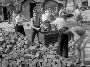 A Mafirt dolgozói táblákkal vonulnak a Szabadság-hídhoz. Téglarakodás, talicskázás, gerendacipelés a híd lábánál. Kaláka. Mafirt táblával felvonuló csoport a forgalomnak átadott hídon.