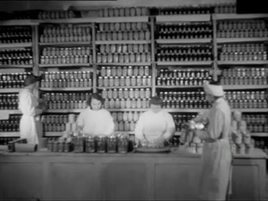 Gyümölcsöt öntenek a futószalagra a munkások egy konzervgyárban. Asszonyok válogatják a gyümölcsöt. A gyümölcs felodolgozás munkafolyamatai: feldolgozás, főzés, ládázás, raktározás.