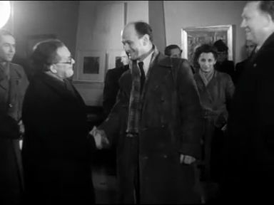 A szovjet adományt veszi át egy hivatalnok a repülőtéren. A bálák teherautóra rakodása. Teherautók érkeznek a Nemzeti Segély Országos Központjához. A rakomány lerakodása. Ciril feliratú doboz. Szovjet katonák. Az adomány kicsomagolva a raktárban. Ruhákból válogatnak a rászorulók. "Az elhagyott gyerekekekért" feliratú plakát.