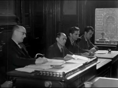 Rudolf Höss a tárgyalóteremben fülhallgatóval, mögötte fegyveres őrök. A bírói pulpitus és a bíróság tagjai. A tábor barakkjai és a kerítés (külső). Őrtorony. Rajzok a haláltábori életről. Höss beszél a bíróságon.