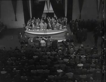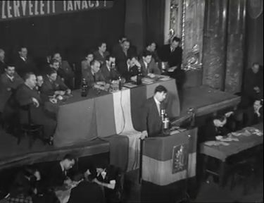 Nemzeti színű zászlóval díszített pulpitus, mögötte politikusok ülnek. Látka János és Komenov Pál, a szakszervezet elnöke beszél a gyűlésen. Vas Zoltán az elnökségben; Csillag Béla főtitkár, majd Vas Zoltán beszél. Arcok a közönségből. Tapsoló emberek.