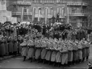 A gellérthegyi emlékmű kicsinyített mása. Dinnyés Lajos miniszterelnök beszél vendégeinek parlamenti szobájában. Szviridov altábornagy megköszöni az ajándékot. Dinnyés és Szviridov a kerekasztal mellett tárgyal.