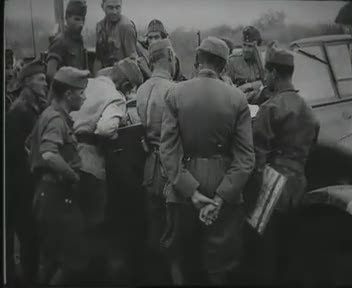 A Borba, Rudé pravo, Pravda, Szabad Nép, címlapjai. Farkas Mihály, majd Révai József nyilatkozik egy íróasztal mellett a riporternek (Farkas, Révai szinkron).
