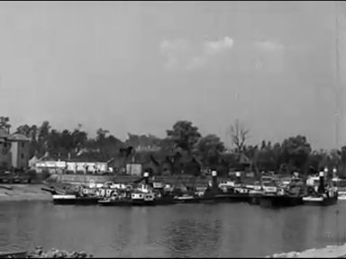 Munkások rögzítik a hídelemet az úszódaruhoz. A hídrész uszályra helyezése. A háttérben a Margit híd. Az uszály a Dunán halad Tahitótfalu felé. A hídrészt csigasorokkal emeleik fel a munkások és szerelik össze a pilléreken lévő újjáépített hídrészekkel.