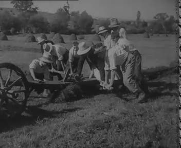 Sokaság a véméndi Szent Mihály templom körül. Gyetvai Jenő főispán beszédet mond. "Könyvtárat az ország minden falujába" és "Jó könyvet minden dolgozó kezébe" feliratok a transzparenseken. A könyvek kicsomagolása, szortírozása. Olvasó helyiek.