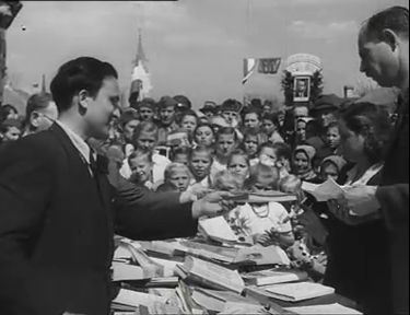 Havas utca Kiskunhalason; a katonai egység tisztelegve fogadja az érkező Dinnyés Lajost és kíséretét. Házi Árpád alispán mond beszédet az emelvényről. Baranyi Tibor alezredes, zászlóaljparancsnok beszél. A városháza épülete. A katonák esküt tesznek a zászló előtt. Katonazenekar. A díszmenet elvonul Dinnyés Lajos előtt.