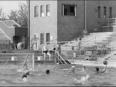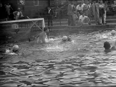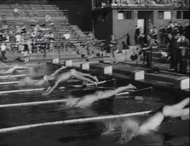 Férfi gyorsúszó verseny a Hajós Alfréd uszodában. Operatőr kis méretű kamerával filmez a part mellől. Münnich Ferenc a nézők között. Mitró György becsap a célba. Vízilabda mérkőzés; gól.