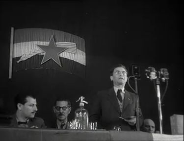 Elhangzó szöveg: A csepeli Sportcsarnokban gyűltek össze a Vörös Csepel dolgozói, hogy meghallgassák Révai Józsefet, a Szabad Nép főszerkesztőjét. Révai József az új kollektív szerződéssel és a normarevízióval kapcsolatos kérdéseket ismertette. Ma az országban a munkásosztály a gazda. Nemcsak szakszervezeti szempontok, hanem kormányzati szempontok is kell, hogy vezessék. A szocializmus győzelméhez nem elég sorra-rendre szétzúzni belső ellenségeinket, szükség van a munka termelékenységének emelésére. Ezért szükséges a normák felülvizsgálása, mondotta Révai József. A szabatos normákkal ösztönzést adunk a termelés, a munkaszervezet rejtett tartalékainak felszínre hozatalára. A normarevízió végső soron arra szolgál, hogy a magyar dolgozó nép a magyar munkásosztály életszínvonalát valóban gyorsan emeljük. A normarendezés során megtakarított összegek visszakerülnek a dolgozókhoz, fejezte be beszédét Révai József.