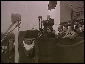 A Láng Gépgyár sporttelepe. Rákosi Mátyás beszéde a dísztribünről (élő). Hallgatóság tömeg- és közelképei. Filmoperatőr kamerával. Illusztratív képsorok: nehézipar, gépesített mezőgazdaság, újjáépítés (épületek, vasút, hidak). Az emelvényen Rákosi mellett Marosán György, Szakasits Árpád, Gerő Ernő, Farkas Mihály és mások).