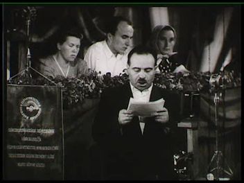 Budapesten, az Újvárosháza Tanácstermében tartották a földműves szövetkezetek küldöttei első országos közgyűlésüket. Gazdag ajándékok fejezik ki parasztságunk szeretetét és megbecsülését a szövetkezetek iránt. A közgyűlésen a baráti népi demokratikus országok küldöttei is megjelentek. A szövetkezetek eddigi munkájáról Dégen Imre, a SZÖVOSZ főtitkára számol be. [Dégen Imre]: "Az országban jelenleg 2837 községben 3010 földműves szövetkezet működik. A földműves szövetkezetek tagságában fúzióval és azt követő tagtoborzási kampánnyal ugrásszerű tagszaporulat következett be. Míg 1948. decemberében a szövetkezeteknek csak 425.000 tagjuk volt, addig ma már a taglétszám a 870.000 főt elérte. /taps/ Külön rá kell mutatni arra, hogy míg az egész taglétszám mintegy 100 %-kal növekedett, ezen belül a parasztasszonyok és fiatalok számának növekedése mintegy 170%-ra tehető. /taps/ A 870.000 holdra kötött termelési szerződés, a gépállomások munkájának szervezettebbé és gazdaságosabbá tételében való közreműködés, a falu nemesített vetőmaggal, műtrágyával való ellátása, a szerződéses hízlalás és tenyésztés széles körben való megszervezése: mindezek a földműves szövetkezet termelési tevékenységének nemcsak megnövekedéséről, de helyes irányban való fejlődéséről is bizonyságot tesznek. Széleskörű nevelő és felvilágosító munkával segítse elő a földműves szövetkezet a falu és város olyan viszonyát, mely megkönnyíti és elmélyíti a haladás élén járó tömegek és a dolgozó parasztság közötti kapcsolatot, a falu dolgozóinak a szocialista építés munkájába való bevonása, az elmaradt tömegeknek a haladás élén járó tömegek színvonalára való emelése, a falu és város közötti különbség megszüntetése érdekében." /taps/ Donát Ferenc a Magyar Dolgozók Pártja nevében kíván eredményes munkát a szövetkezetek további építésében. Ökrös Sándorné rajkai bíró és szövetkezeti vezető hozzászólásában a nők szövetkezeti tevékenységét ismerteti. [Ökrös Sándorné]: "Mi, parasztasszonyok sokan vagyunk már olyanok, akik bebizonyítottuk azt, hogy vezetéshez is értünk. Ott is egyenrangú társai vagyunk a férfiaknak. Éppen ezért megkérem az itt megjelent szövetkezeti vezetőket, hogy ha náluk még mindig volna ilyen régi gondolkozású, azok meggyőzésére példával mutassanak rá! Arra, hogy az asszonyok képesek a saját családjuk nevelése mellett még a szövetkezet gazdasági életét vezetni." A nagy jelentőségű gyűlés lelkes hangulata azt bizonyítja, hogy parasztságunk világosan látja a szövetkezeti gazdálkodás jelentőségét, és a közgyűlés után a Magyar Dolgozók Pártjának irányításával még szélesebb körben igyekszik azt megvalósítani. /taps, "Éljen Rákosi!"/